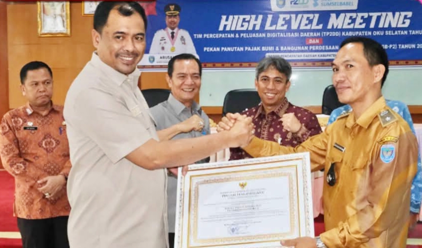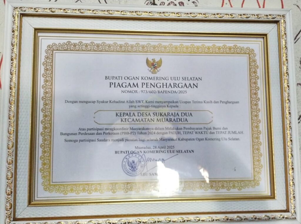 Muaradua Lenterapena. Com — Kepala Desa Sukaraja II, Kecamatan Muaradua, Kabupaten OKU Selatan, Sarmubi, menerima penghargaan sebagai Pembayar Pajak Terbaik dari Badan Pendapatan Daerah (Bapenda) OKU Selatan.Kamis (22/05/2025).
